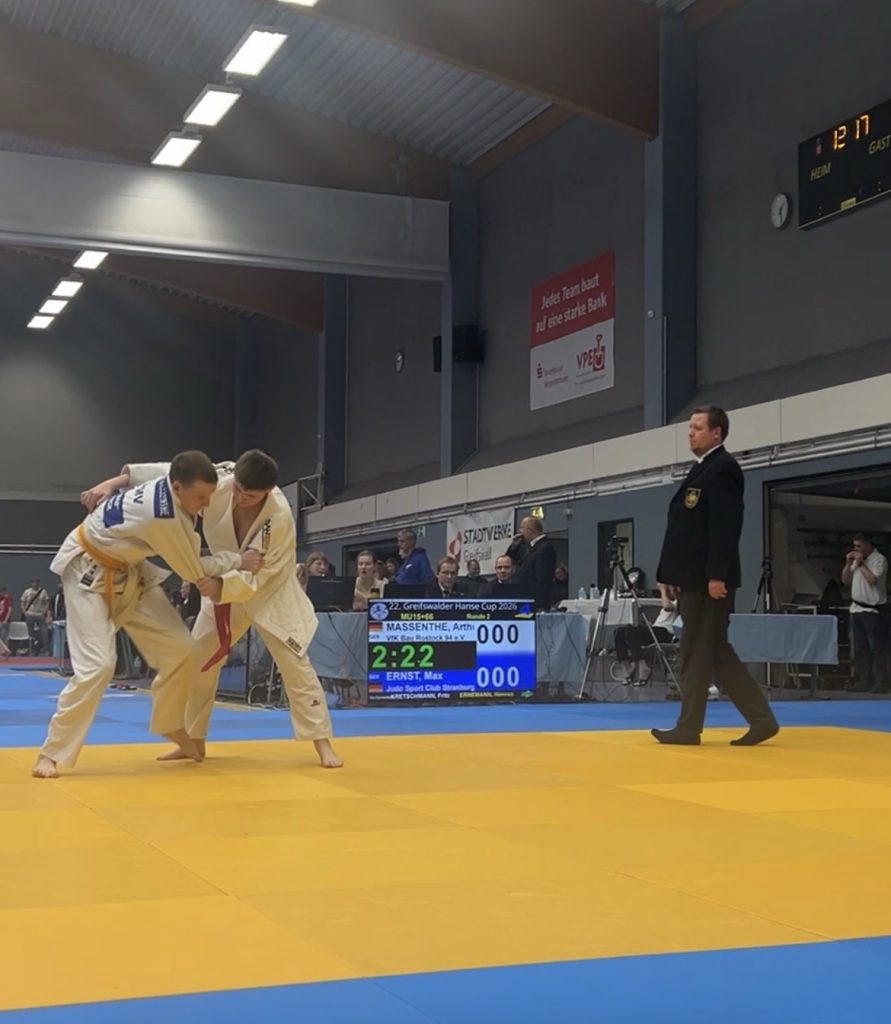 Da sich derzeit fast unsere gesamte Wettkampfgruppe auf die Prüfung zum nächsthöheren Kyu vorbereitet, reisten wir in diesem Jahr nur mit einer kleinen Delegation zum hochklassig besetzten Hanse-Cup nach Greifswald. Für den JSC gingen mit Max und Henry zwei Judoka in der Altersklasse U15 an den Start.